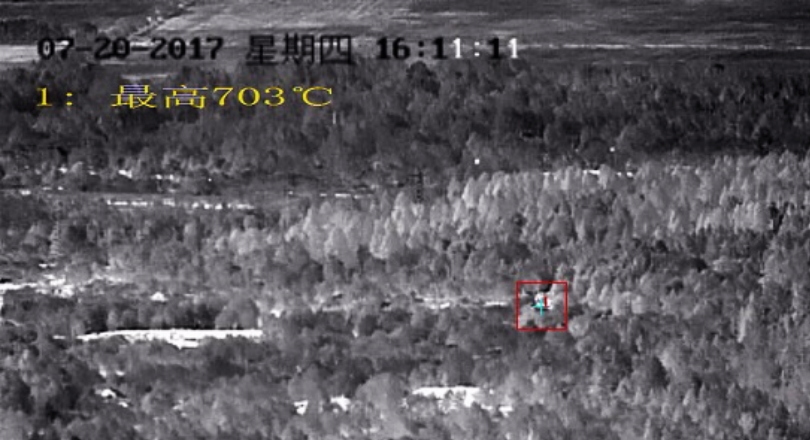 云臺實現了煙火的實時動態檢測,相對后端檢測的形式,提升了檢測效率,發現目標更快速更準確,規避由于遠距離傳輸圖像延時、丟失帶來的漏檢。同時還可設置煙火屏蔽區域以及利用可見光進行火情的清晰確認,利用可見光的同軸定位功能,無偏離同步定位查看細節,同時,可見光可自動調整倍率快速聯動跟蹤,確認火點。實測中,熱成像火點后,可見光立即同步調整與變焦,將火點區域置于畫面中心。