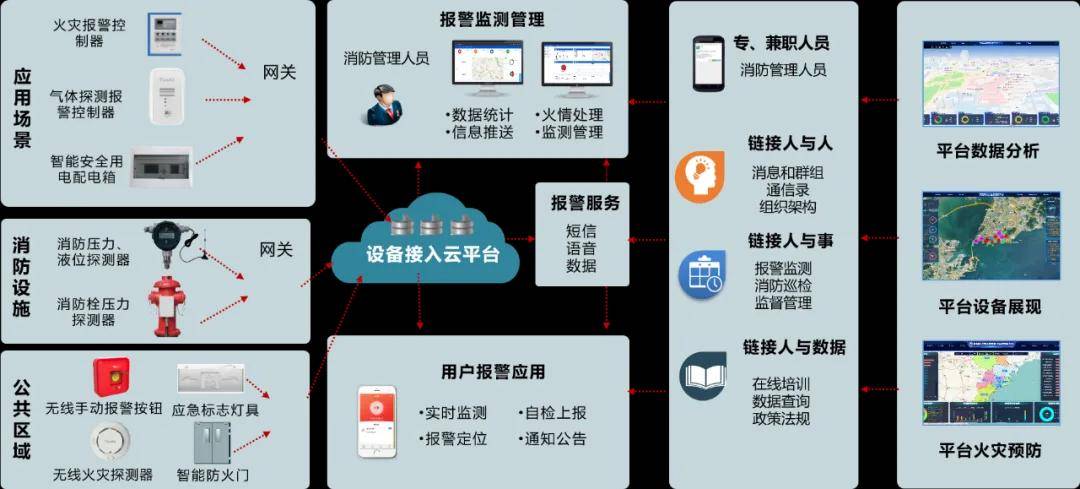 通過在關(guān)鍵區(qū)域部署電氣火災(zāi)監(jiān)測(cè)系統(tǒng)、消防用水監(jiān)測(cè)管理系統(tǒng)、火災(zāi)自動(dòng)報(bào)警系統(tǒng)、消控室遠(yuǎn)程控制系統(tǒng)、可燃?xì)怏w探測(cè)系統(tǒng)等感知設(shè)備,實(shí)時(shí)監(jiān)測(cè)電氣故障、消火栓狀態(tài)和可燃?xì)怏w泄漏等實(shí)時(shí)信息。